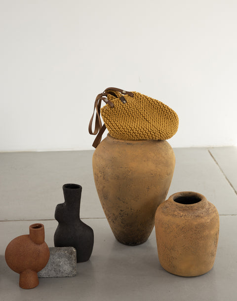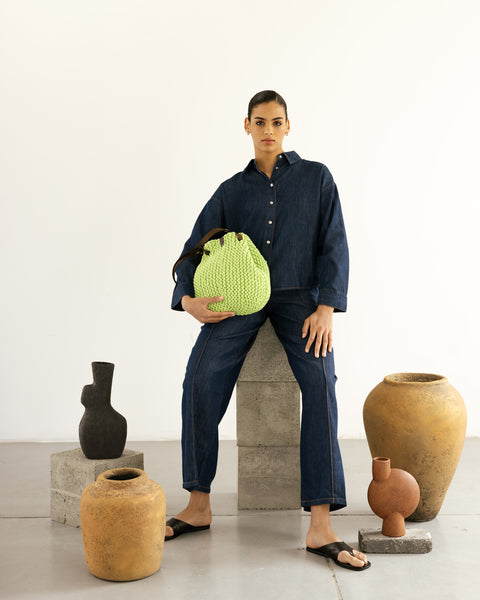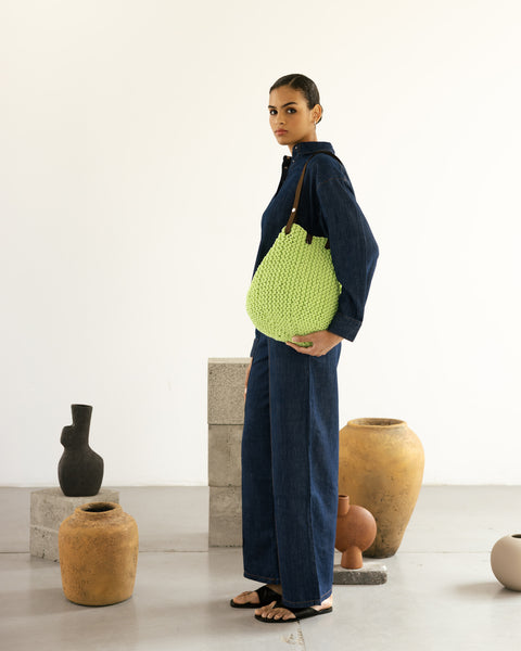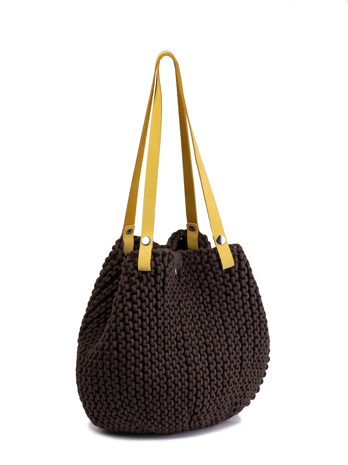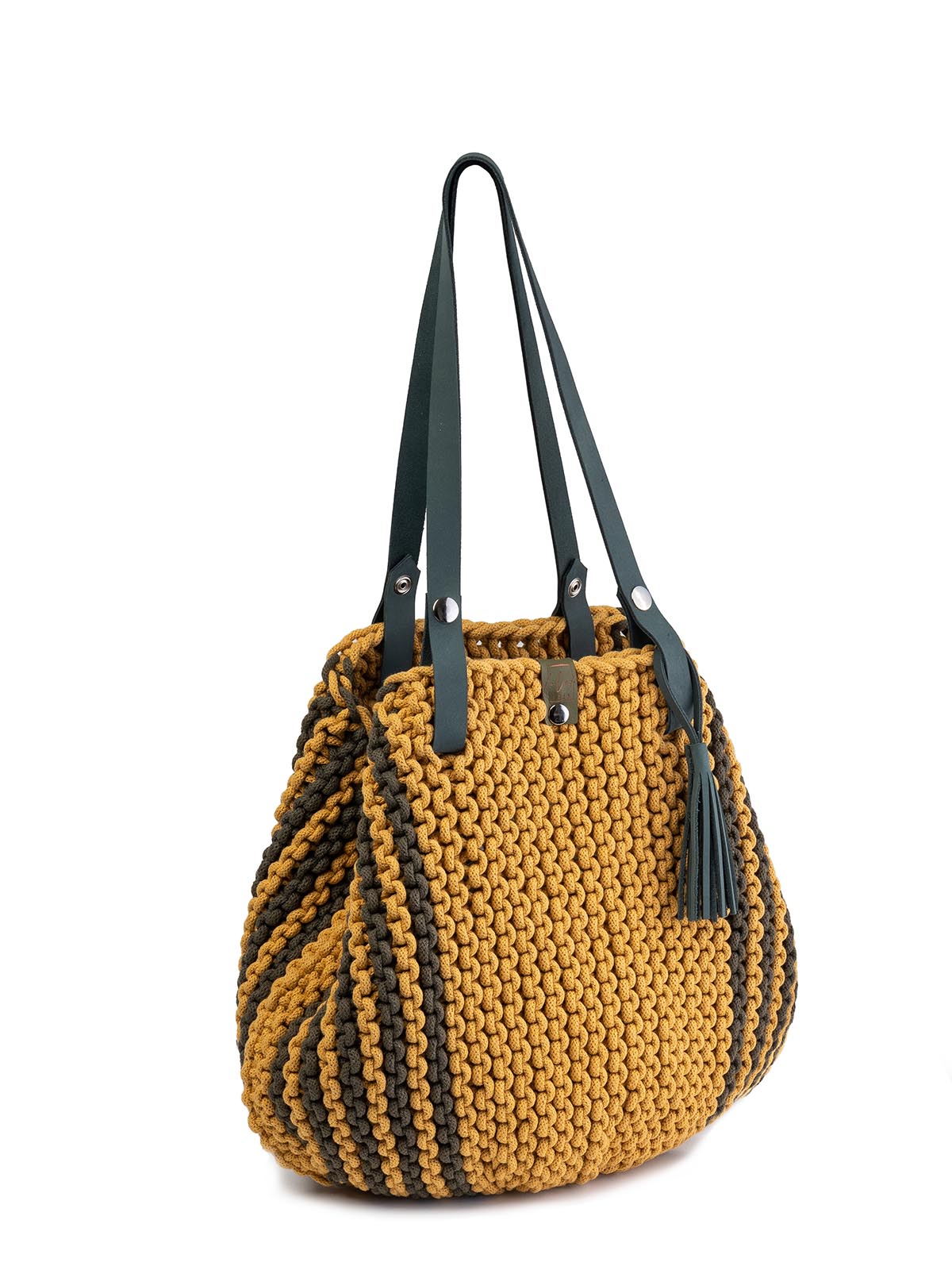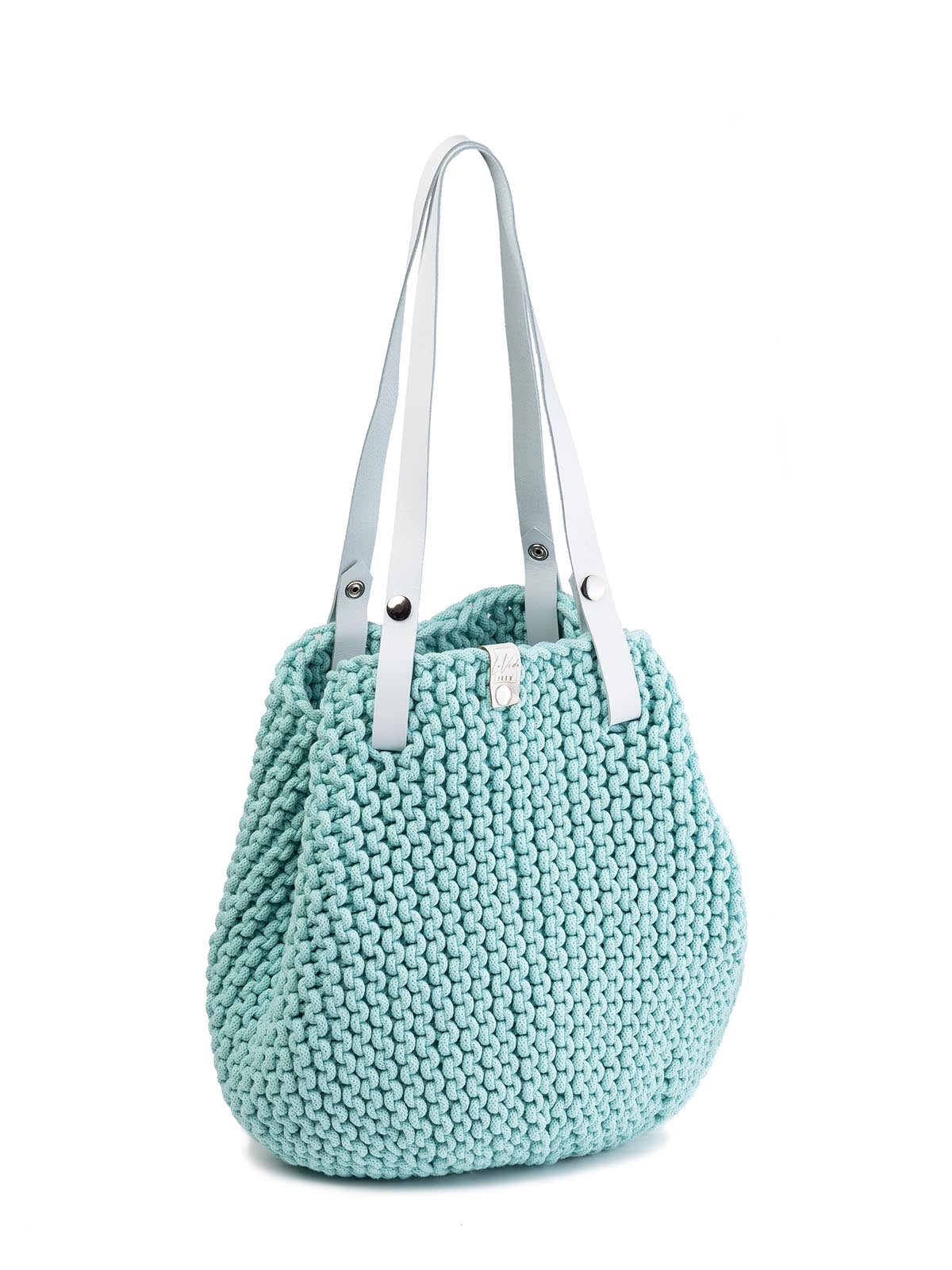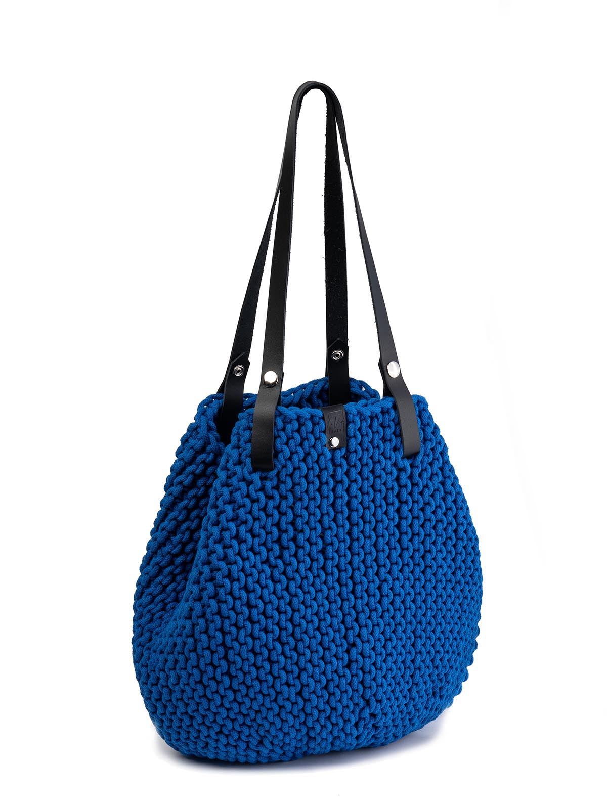 Ez a modell prémium minőségű 100% újrahasznosított fonalból készült. A táska kötése során keletkező maradék fonalakból zero waste kosarak és faliképek készülnek, így minden hasznosításra kerül.