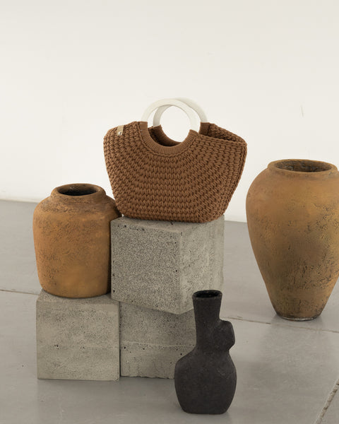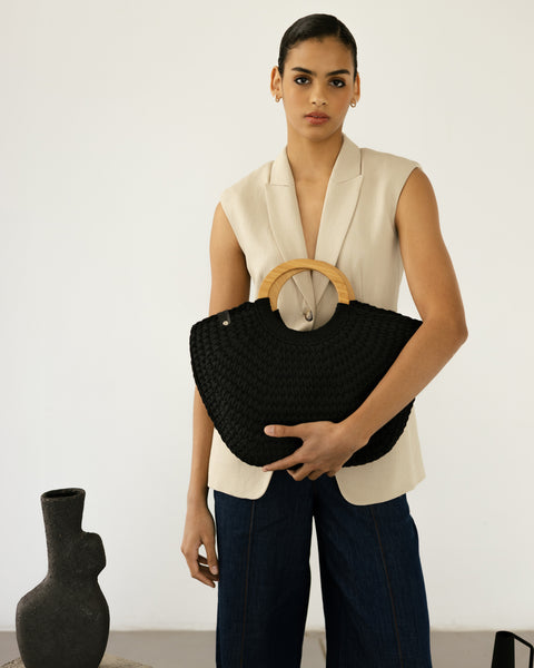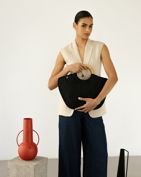 Ez a modell prémium minőségű 100% újrahasznosított fonalból készült. A táska horgolása során keletkező maradék fonalakból zero waste kosarak és faliképek készülnek, így minden hasznosításra kerül.